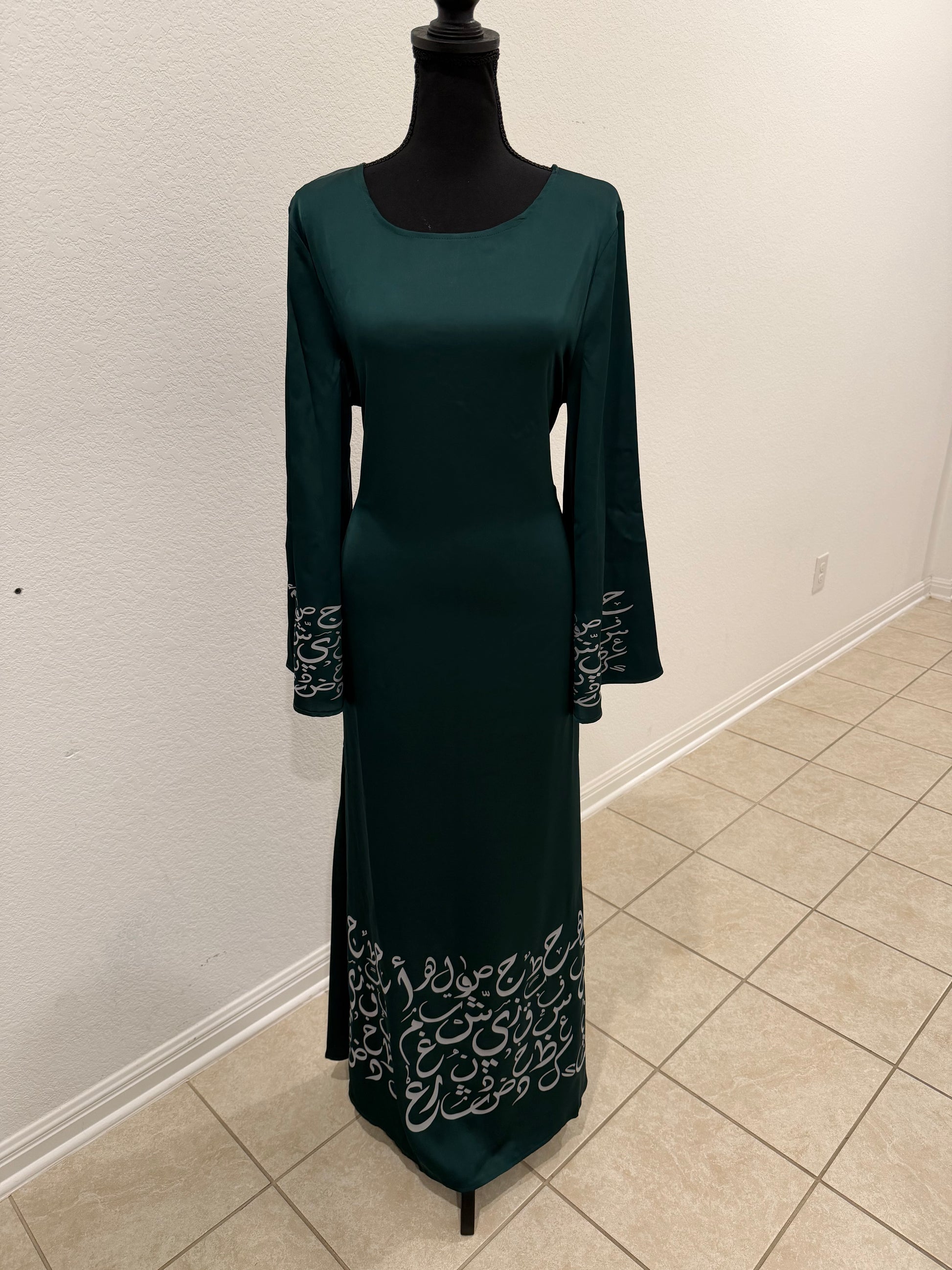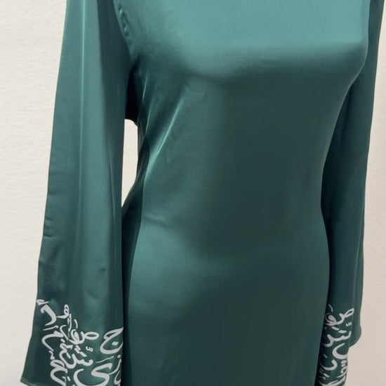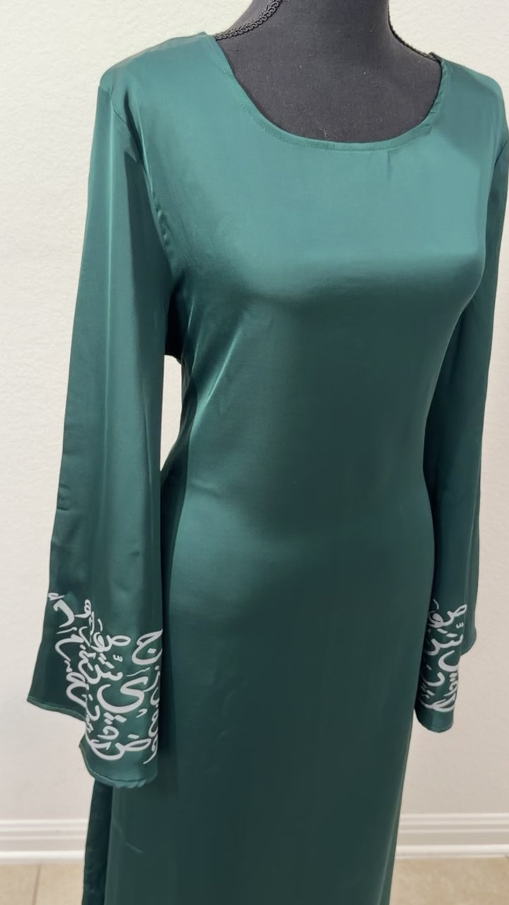 Asalah Abaya embodies timeless authenticity, where flowing emerald tones meet hand-inspired Arabic calligraphy — a tribute to heritage, strength, and refined femininity.