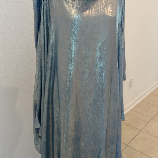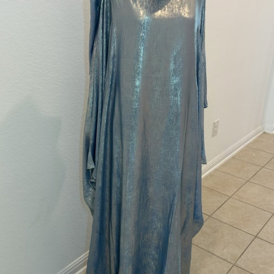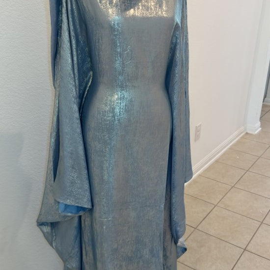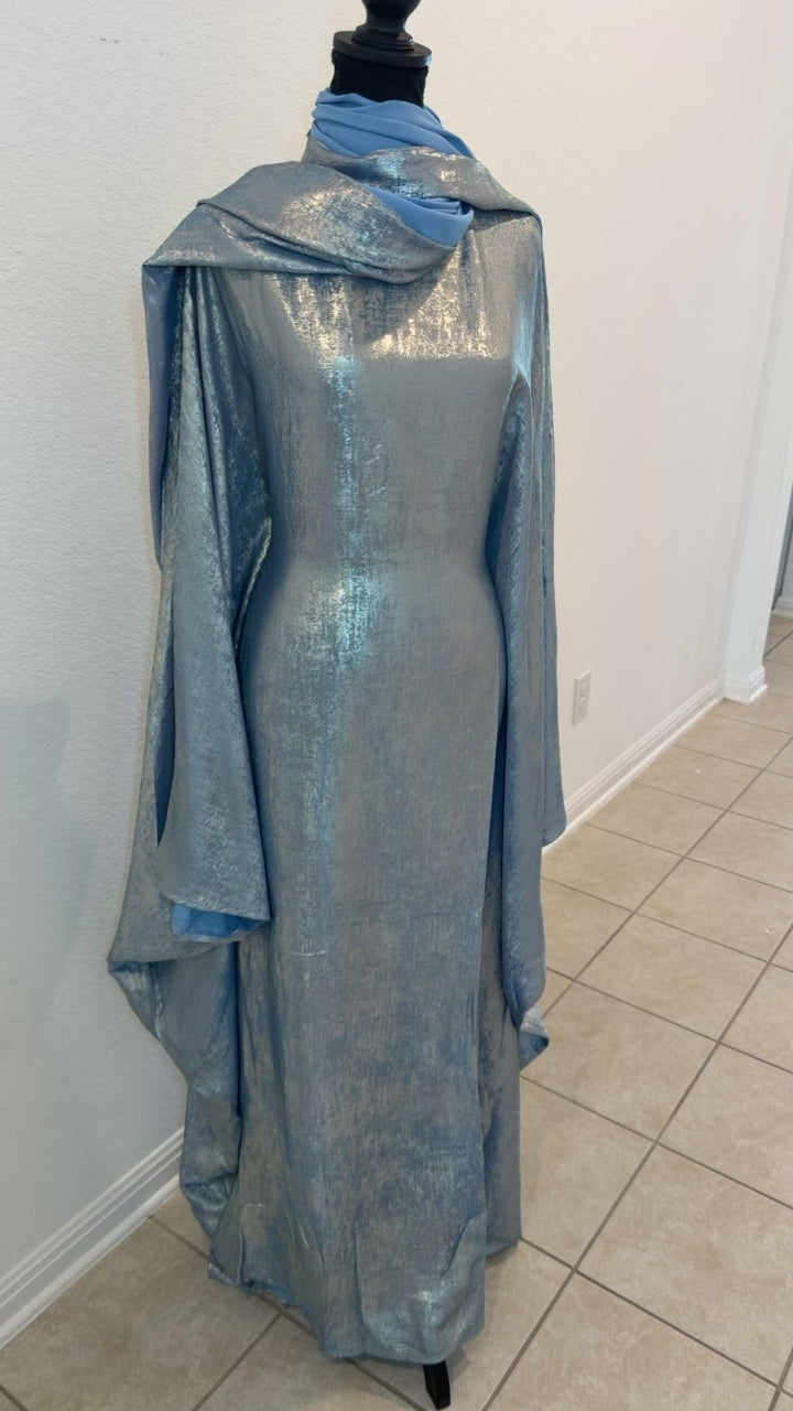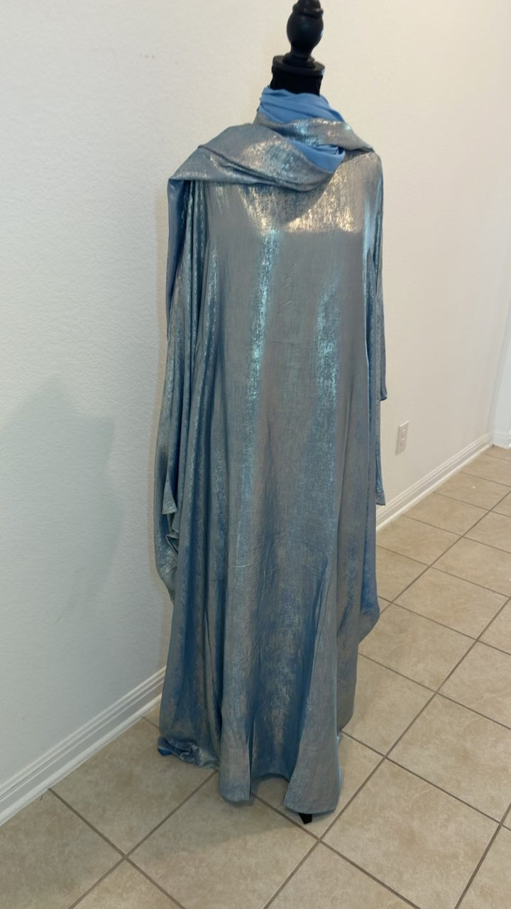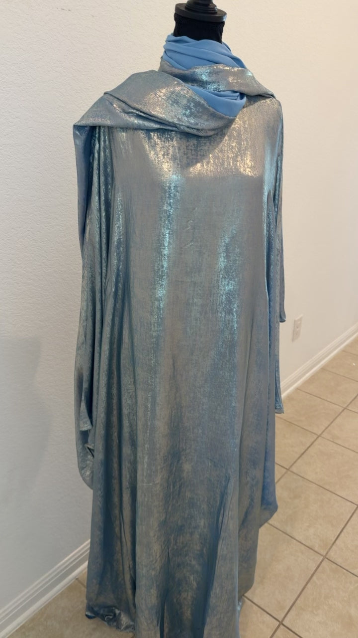 This Farasha abaya flows effortlessly with every step, crafted in a luminous icy-blue metallic fabric that catches the light like moonlight on silk. The silhouette drapes beautifully over the body, creating a soft, regal presence while maintaining modest sophistication.