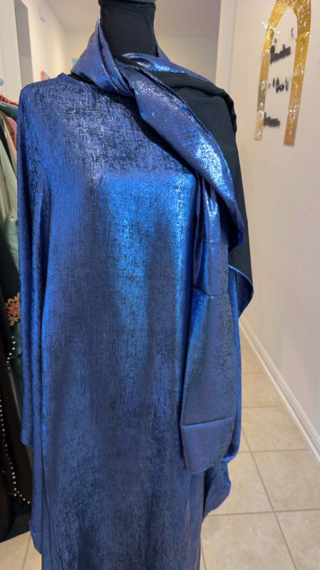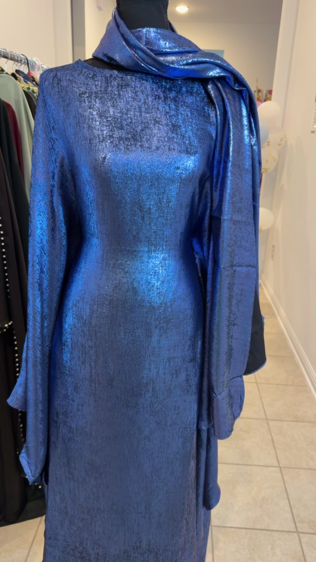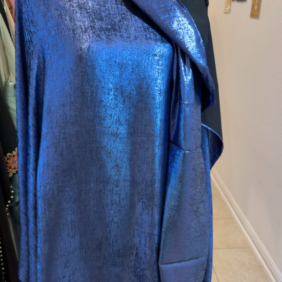 This Farasha abaya flows effortlessly with every step, crafted in a luminous blue metallic fabric that catches the light like moonlight on silk. The silhouette drapes beautifully over the body, creating a soft, regal presence while maintaining modest sophistication.