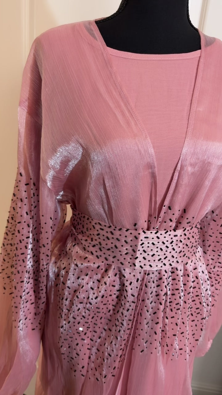 The abaya comes as a two-piece set, featuring a matching inner layer and a detachable belt that allows you to style it loose for a relaxed look or cinched for a more defined waist. Perfect for day-to-day wear, special gatherings, or Ramadan evenings, this piece blends comfort with timeless sophistication.