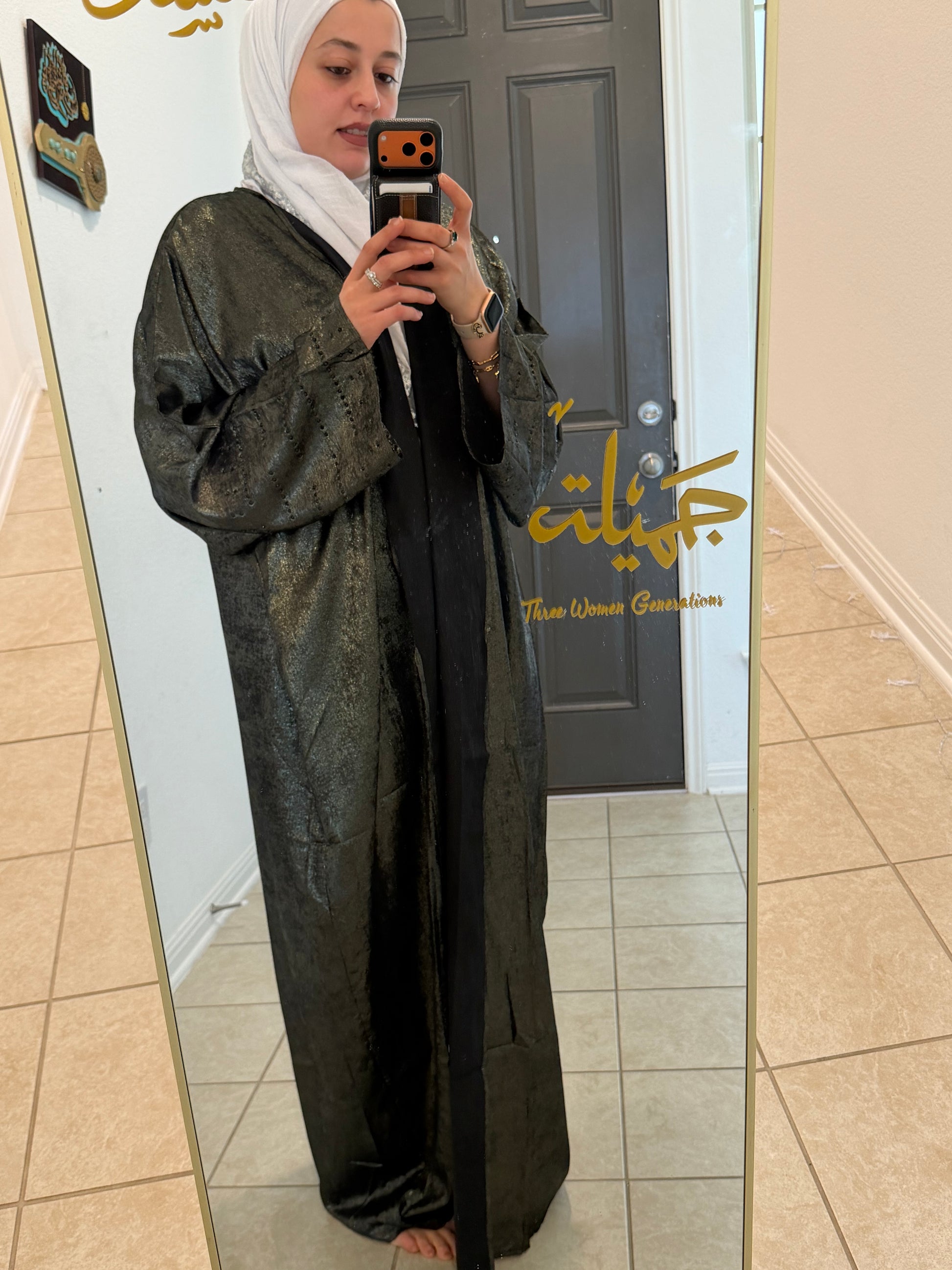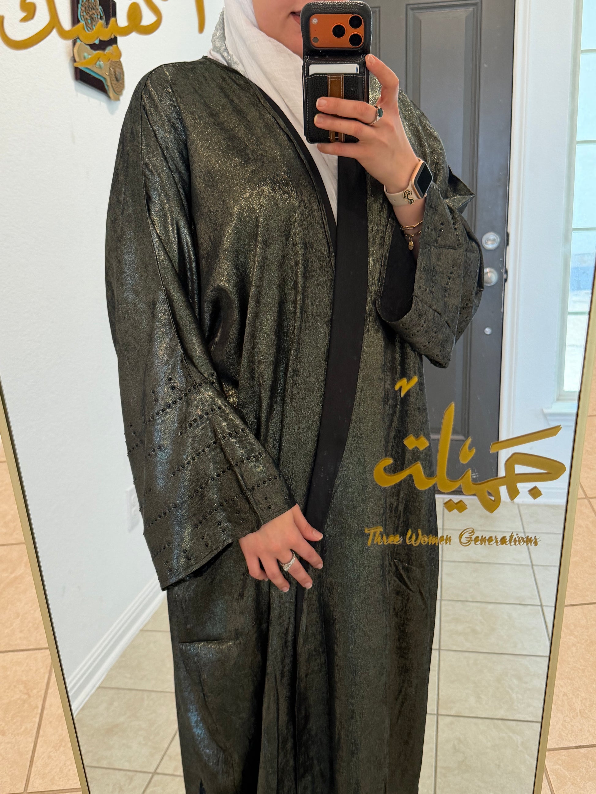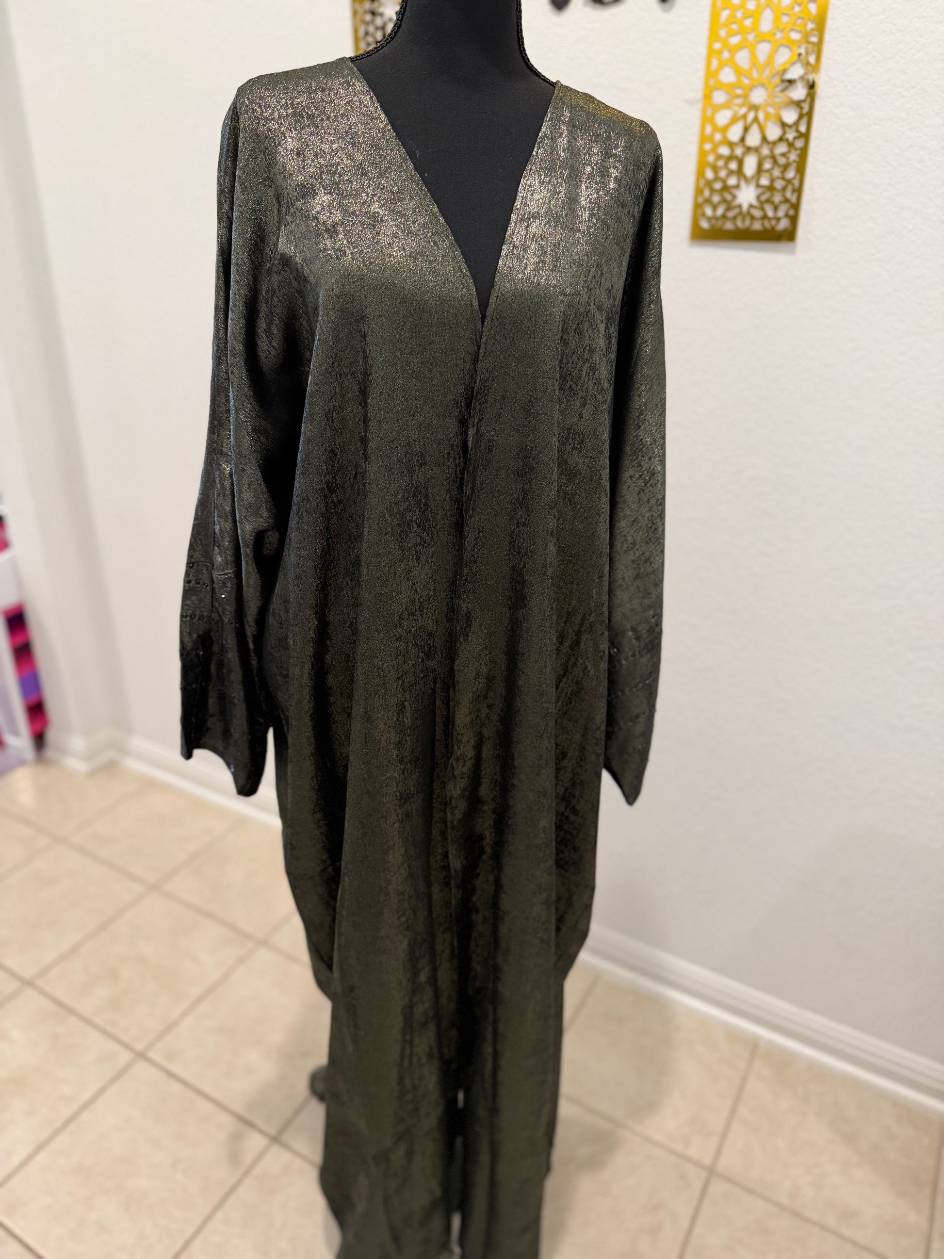 A timeless tribute to Gulf heritage, this Khaliji-style legacy abaya embodies elegance, strength, and refined femininity. Inspired by traditional Arabian silhouettes, it features a flowing cut with wide statement sleeves that move with effortless grace.Intricate embroidery — reminiscent of classic Gulf artistry — adorns the sleeves and front panels, symbolizing heritage passed from one generation to the next. The rich metalic black base enhances with crystals on the sleeves royalty