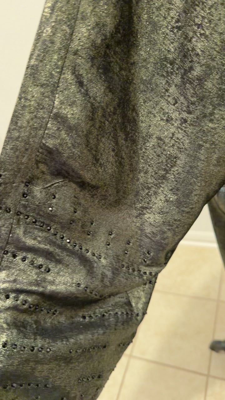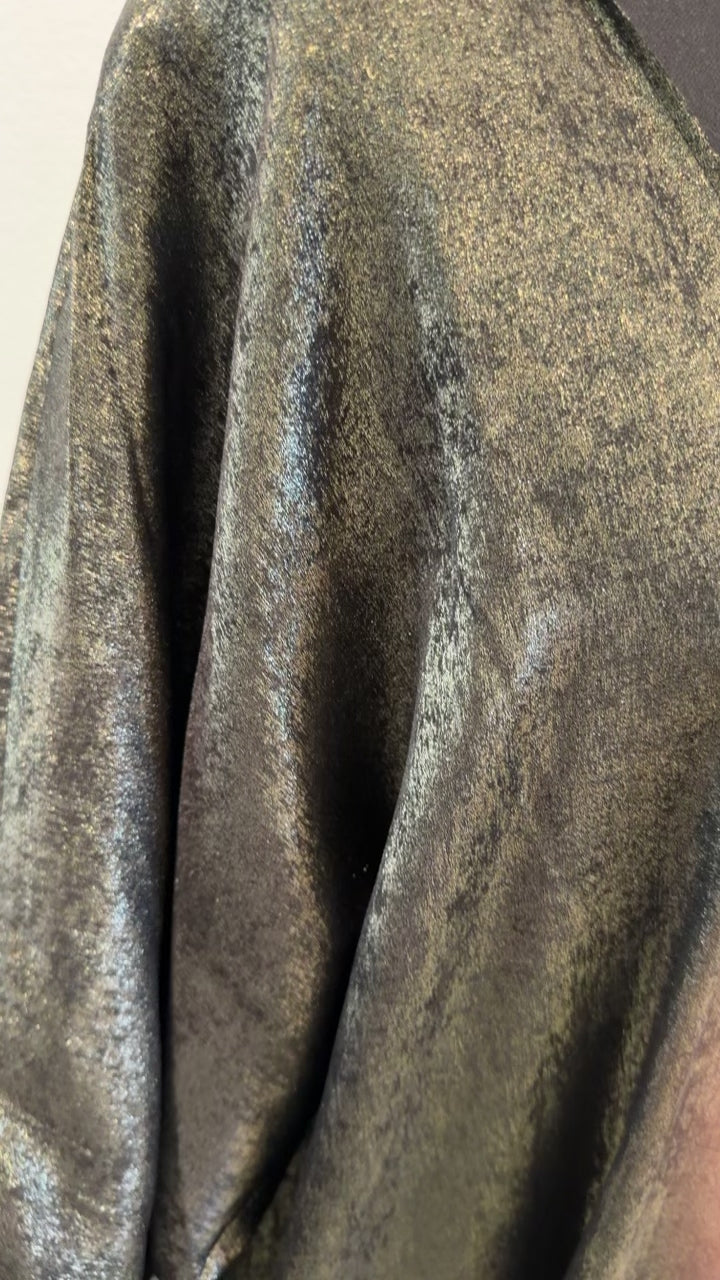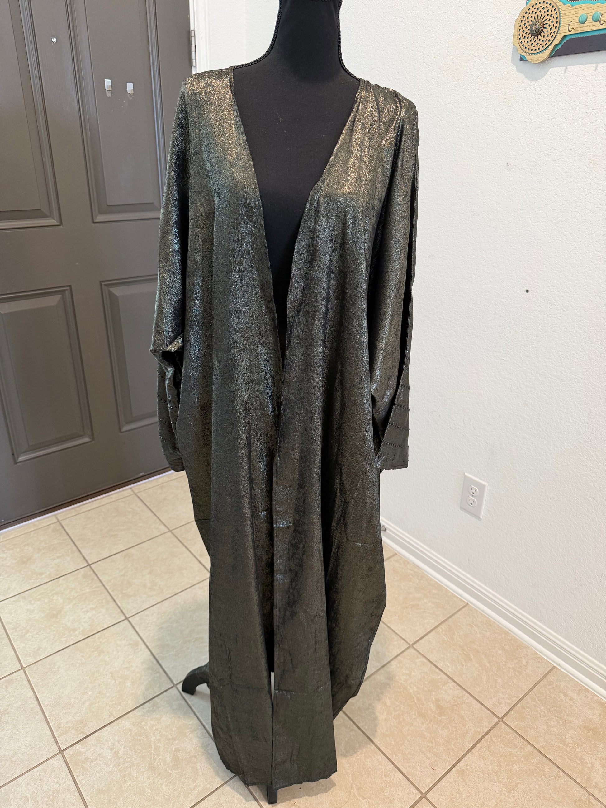 A timeless tribute to Gulf heritage, this Khaliji-style legacy abaya embodies elegance, strength, and refined femininity. Inspired by traditional Arabian silhouettes, it features a flowing cut with wide statement sleeves that move with effortless grace.Intricate embroidery — reminiscent of classic Gulf artistry — adorns the sleeves and front panels, symbolizing heritage passed from one generation to the next. The rich metalic black base enhances with crystals on the sleeves royalty